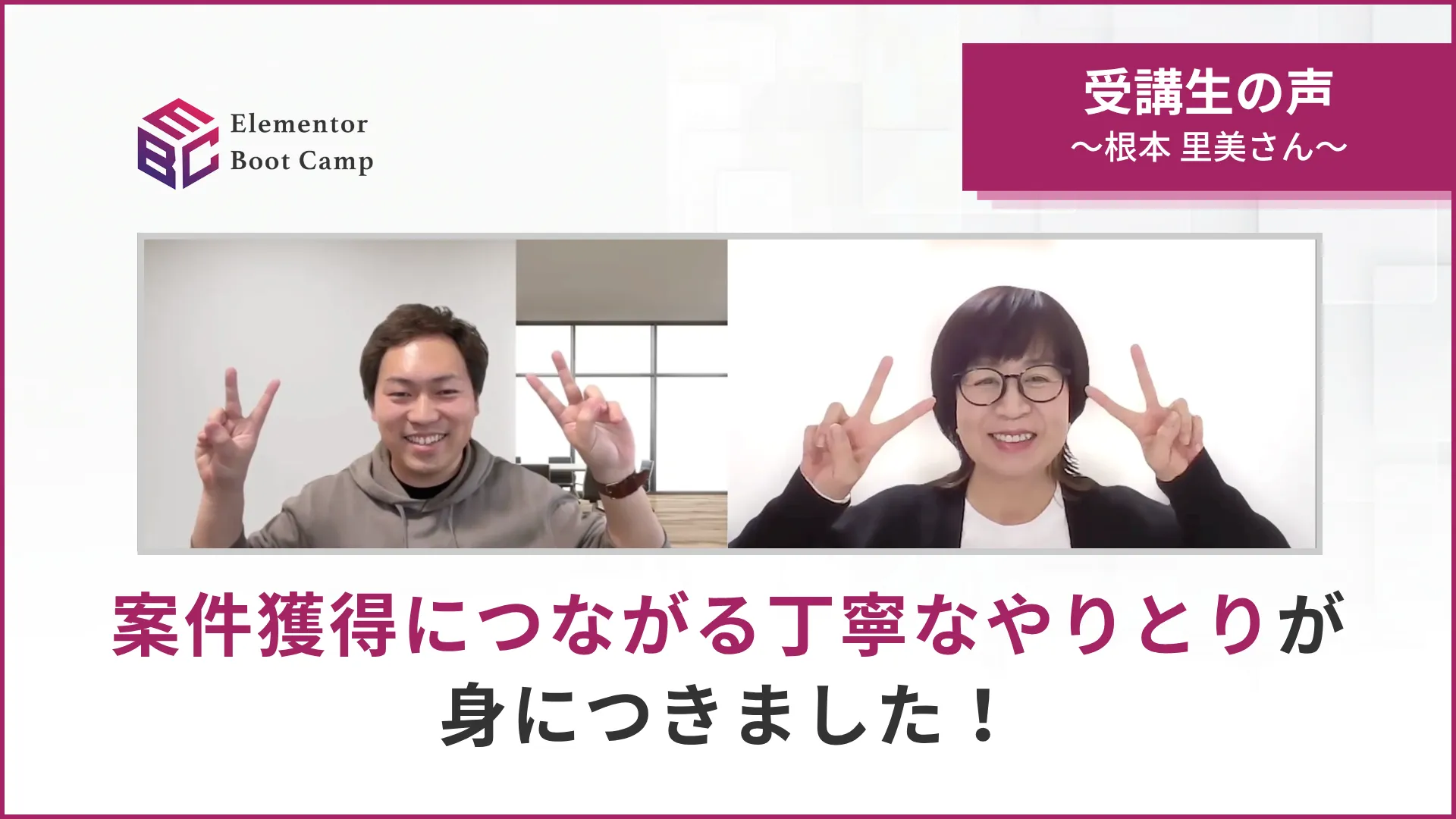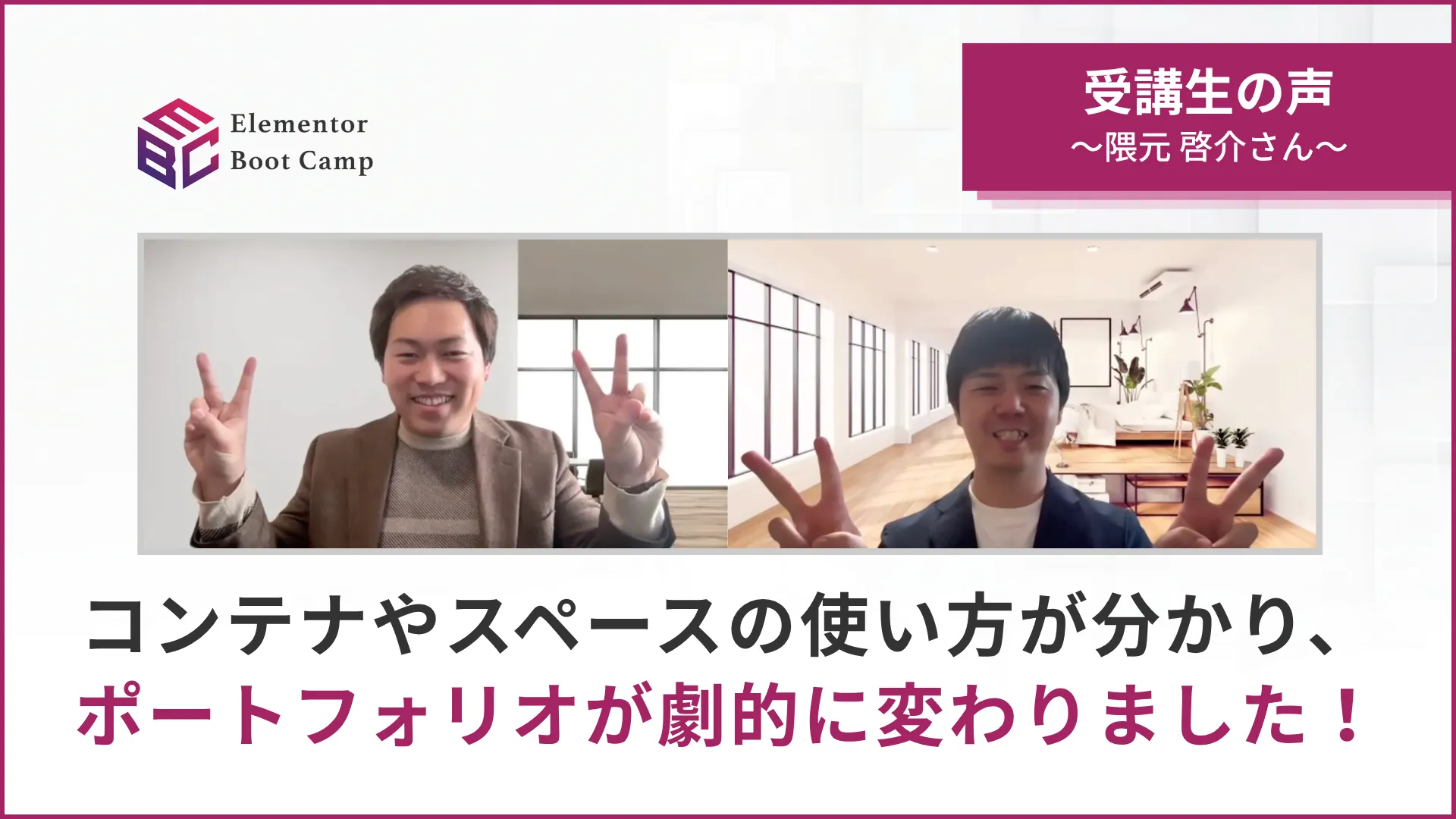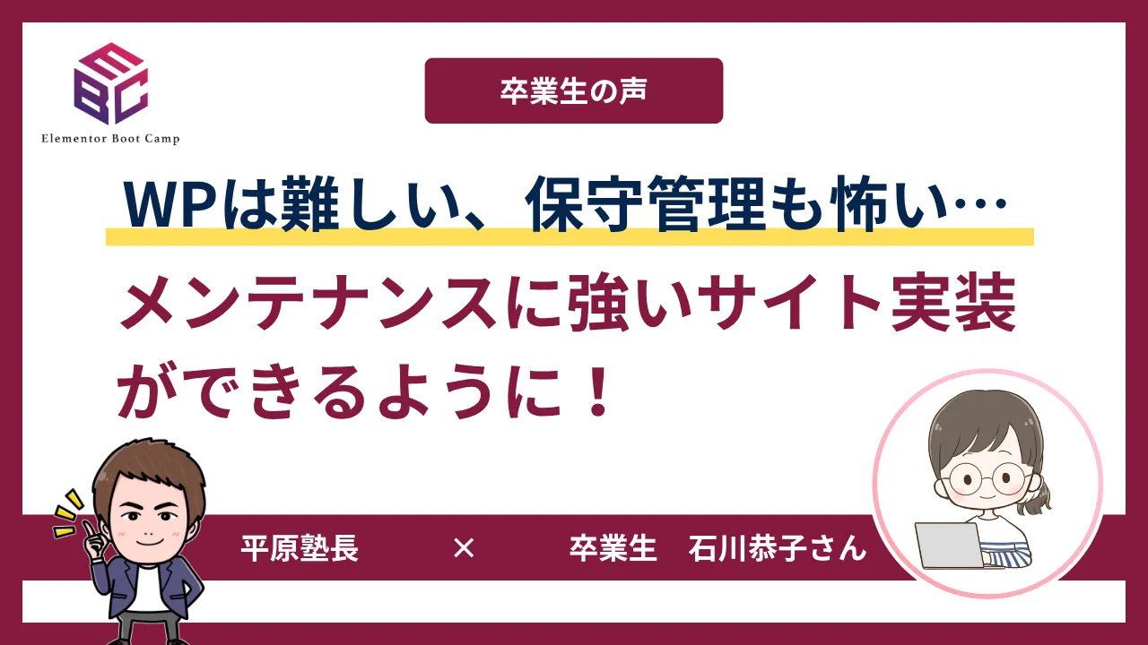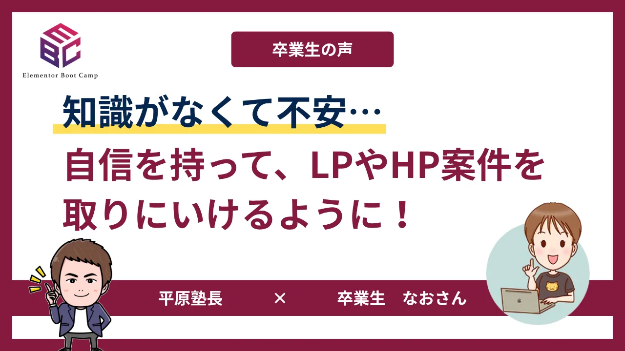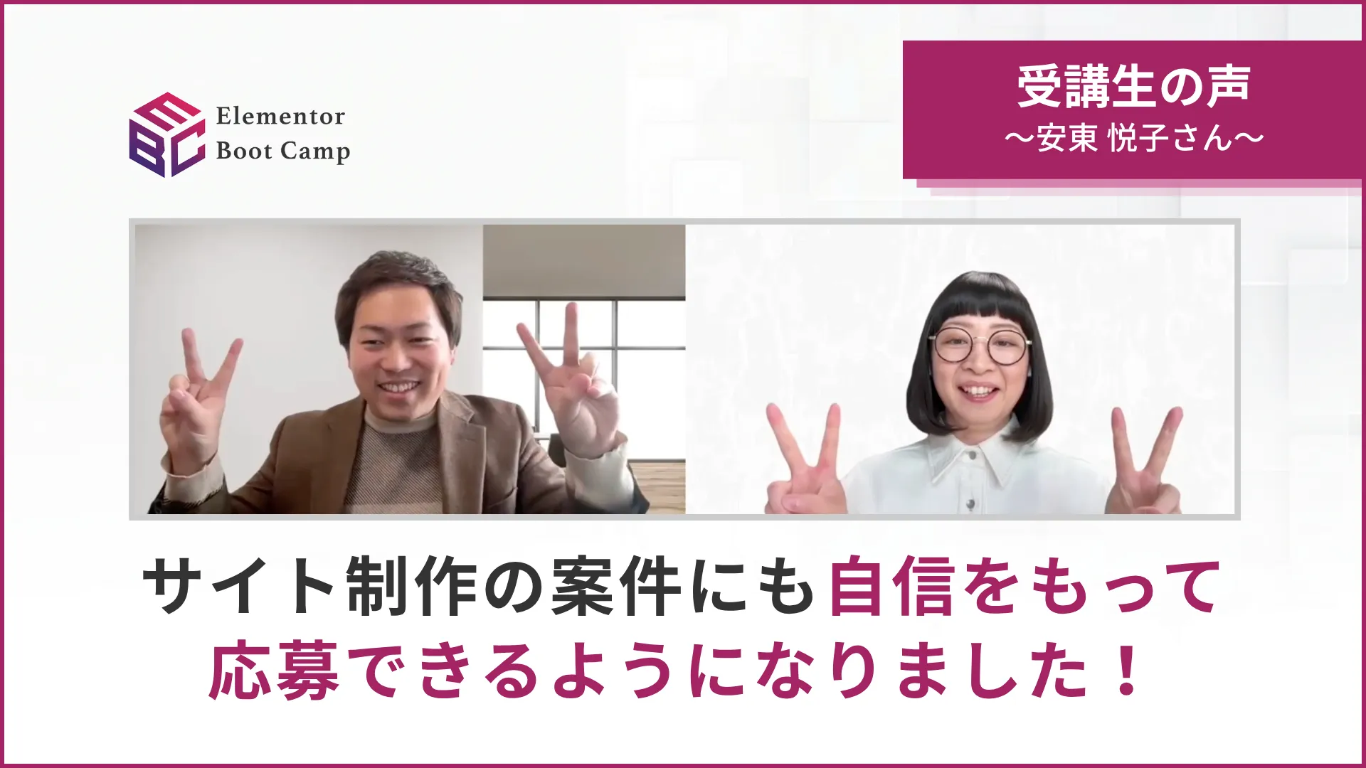 Webデザイナーという肩書きは、誰でも名乗れる時代になりました。しかし、クライアントに“納品できる”スキルを持ち、信頼され、選ばれ続ける人は、一握りです。私自身、Elementorというノーコードツールに出会い、それを武器に、仕事をしてきました。サイトをつくる力が、自信になり、私の人生を変えました。ですが、多くの人が「できない」「怖い」「苦手」と感じている。ほんの一歩なのに、それを越えられない人があまりにも多い。だからこそ、“プロになるための一歩を共に踏み出す場所”をつくると決めました。Elementor Boot Campは、納品スキルを本気で身につけたい人のための実践講座です。コーディングが苦手でも、構築に不安があっても、「やり切る覚悟」がある人なら、絶対に力をつけられる。EBCは、そんなあなたを絶対に見捨てません。Elementor最強!と共に笑い合えるその日まで、本気で、共に進みます。