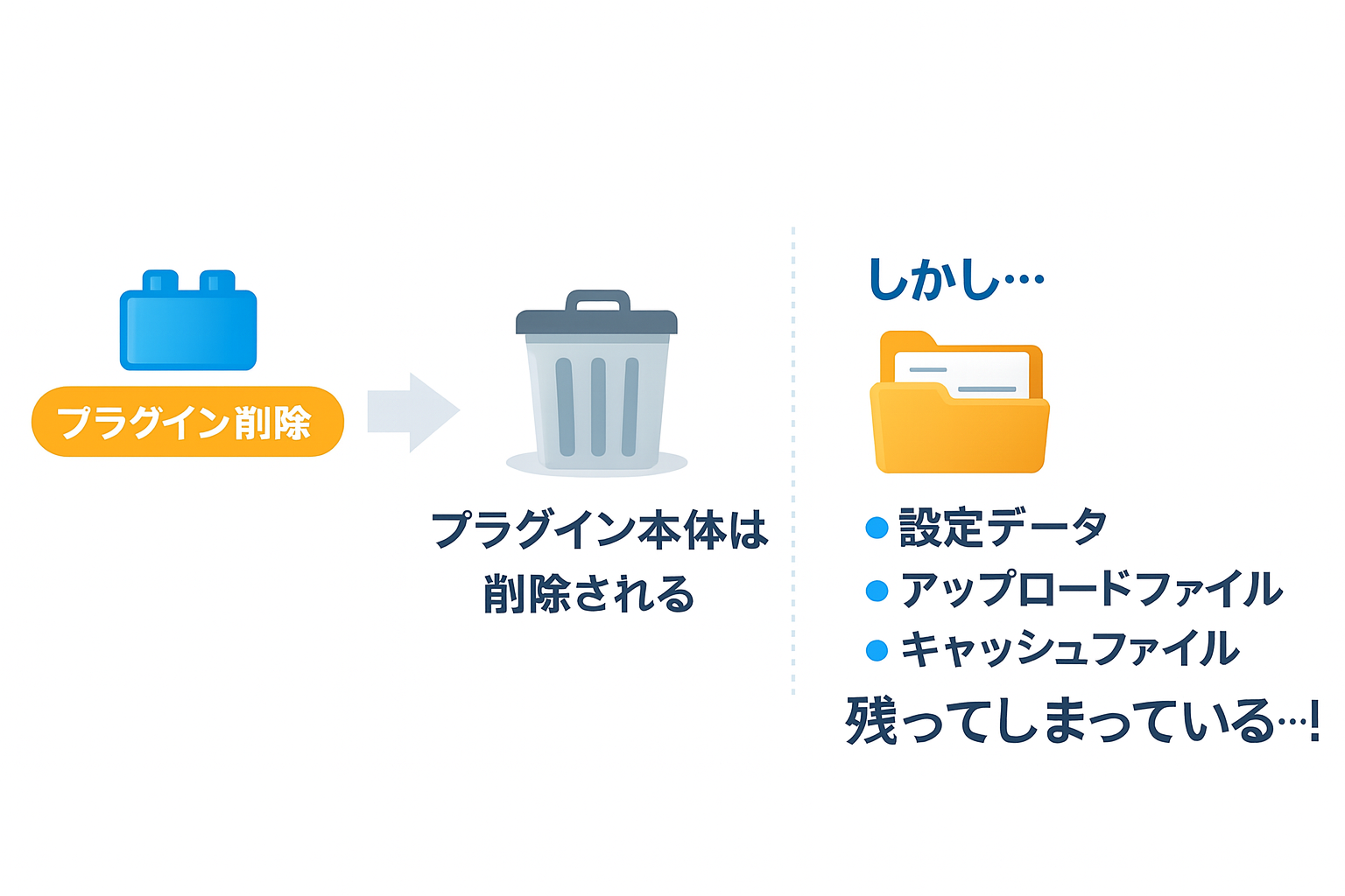 例え不要なプラグインを消しても、全てが入れる前に戻るということはなく、多くの場合、ファイルがいくつか残ってしまいます。